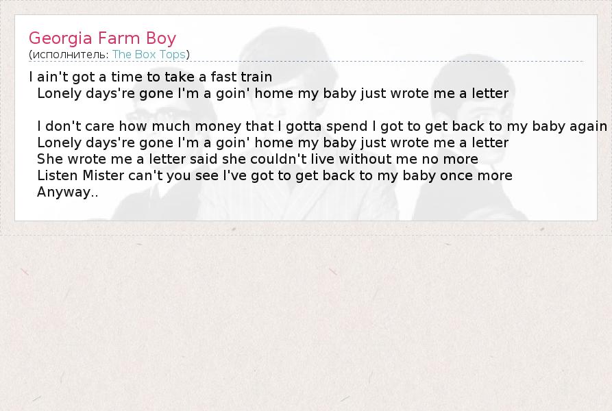 А как ты думаешь, о чем песня "Georgia Farm Boy" ?