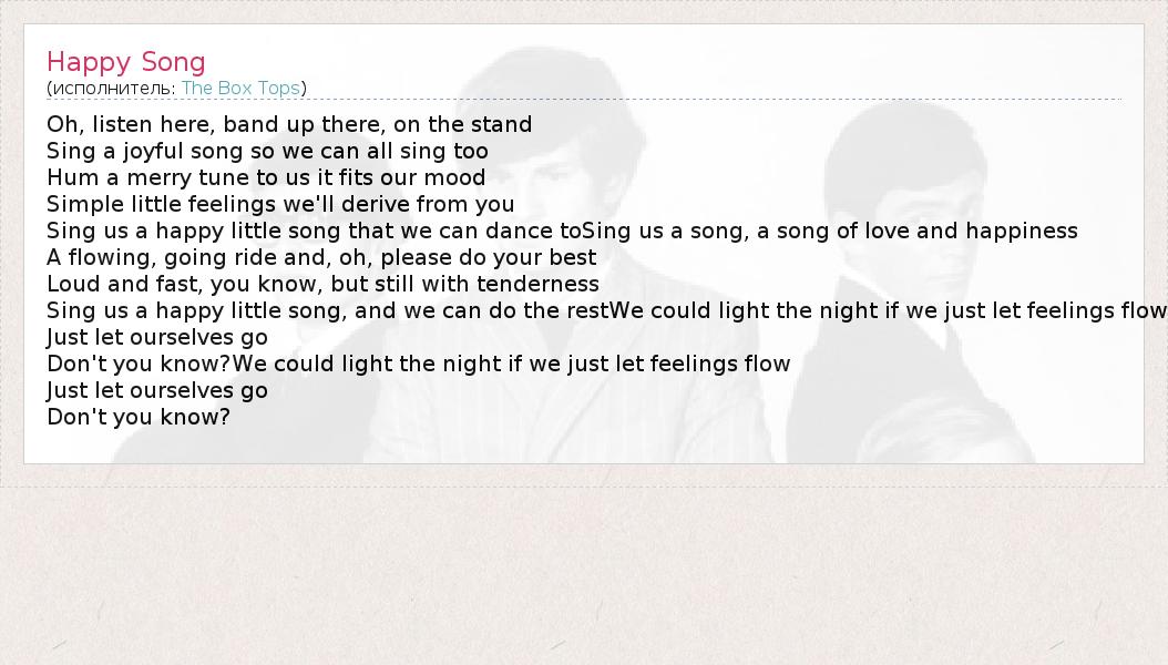 Это интересно:За свою недолгую карьеру "Box tops" заработали себе славу одной из лучших "белых" соул-групп, несмотря на то, что они были не столь плодовитыми, как, скажем, "Righteous Brothers" или "Rascals". История команды началась в Мемфисе (штат Теннеси), где под вывеской "The Devilles" собрались четверо школьных приятелей – Билл Каннингхэм (р. 23 января 1950), Джон Эванс (р. 18 июня 1948), Дэнни Смит (р. 25 августа... продолжение