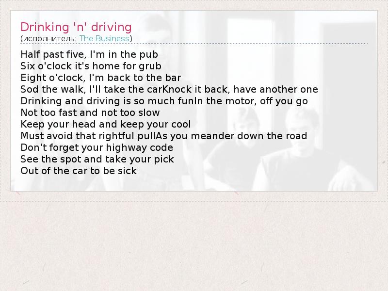 А как ты думаешь, о чем песня "Drinking 'n' driving" ?