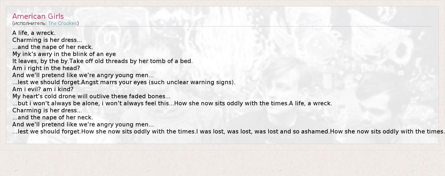 Это интересно:The Crookes - британская инди-рок группа из Шефилда. Состав: Рассел Бейтс (Russell Bates) - барабанщик, Дэниел Хоупвел (Daniel Hopewell) - гитарист, Том Дэйкин (Tom Dakin) - гитарист, Джордж Уэйт (George Waite) - вокалист, басист. На данный момент команда выпустила один ЕР "Dreams of Another Day" (2010), а также три альбома: "Chasing After Ghosts" (2011), "Hold Fast" (2012) и "Soapbox" (2014).