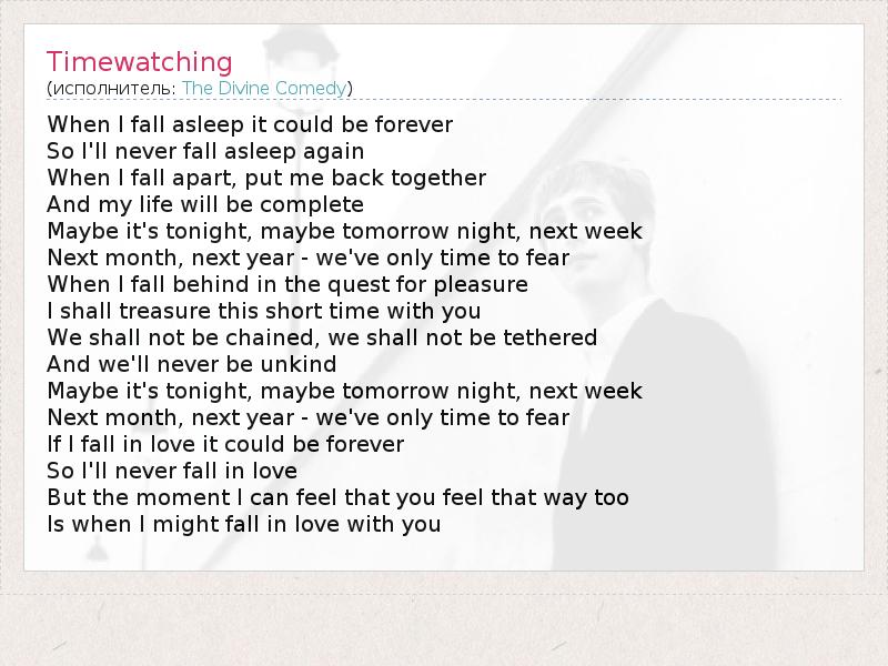 When I fall asleep it could be forever So I'll never fall asleep again When I fall apart, put me back together And my life will be complete Maybe it's tonight, maybe tomorrow night, next week Next month, next year - we've only time to fear When I fall behind in the quest for pleasure I shall treasure this short time with you We shall not be chained, we shall not be tethered And we'll never be unkind Maybe it's tonight, maybe tomorrow night, next week Next month, next year - we've only time to fear If I fall in love it could be forever So I'll never fall in love But the moment I can feel that you feel that way too Is when I might fall in love with you