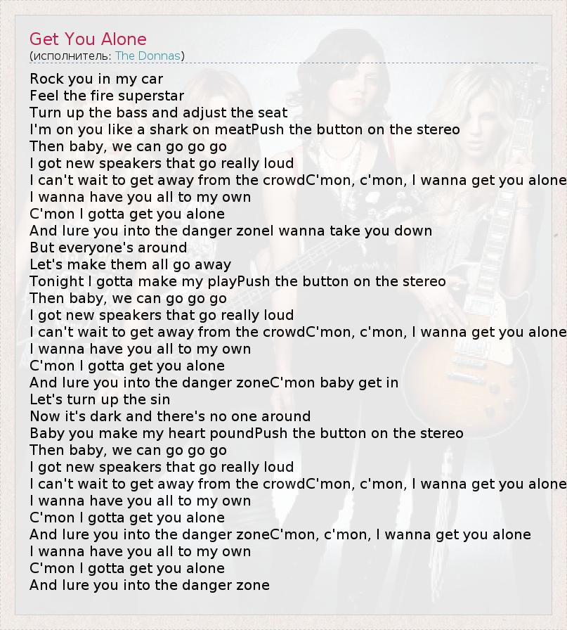 Rock you in my car Feel the fire superstar Turn up the bass and adjust the seat I'm on you like a shark on meatPush the button on the stereo Then baby, we can go go go I got new speakers that go really loud I can't wait to get away from the crowdC'mon, c'mon, I wanna get you alone I wanna have you all to my own C'mon I gotta get you alone And lure you into the danger zoneI wanna take you down But everyone's around Let's make them all go away Tonight I gotta make my playPush the button on the stereo Then baby, we can go go go I got new speakers that go really loud I can't wait to get away from the crowdC'mon, c'mon, I wanna get you alone I wanna have you all to my own C'mon I gotta get you alone And lure you into the danger zoneC'mon baby get in Let's turn up the sin Now it's dark and there's no one around Baby you make my heart poundPush the button on the stereo Then baby, we can go go go I got new speakers that go really loud I can't wait to get away from the crowdC'mon, c'mon, I wanna get you alone I wanna have you all to my own C'mon I gotta get you alone And lure you into the danger zoneC'mon, c'mon, I wanna get you alone I wanna have you all to my own C'mon I gotta get you alone And lure you into the danger zone
