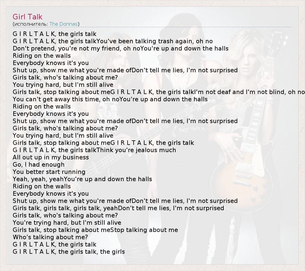 Girls talk, stop talking about meG I R L T A L K, the girls talkI'm not deaf and I'm not blind, oh no