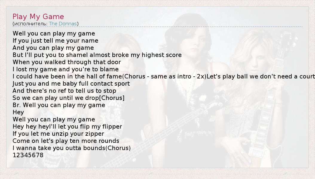 Well you can play my game If you just tell me your name And you can play my game But I'll put you to shameI almost broke my highest score When you walked through that door I lost my game and you're to blame I could have been in the hall of fame(Chorus - same as intro - 2x)Let's play ball we don't need a court Just you and me baby full contact sport And there's no ref to tell us to stop So we can play until we drop[Chorus] Br. Well you can play my game Hey Well you can play my game Hey hey heyI'll let you flip my flipper If you let me unzip your zipper Come on let's play ten more rounds I wanna take you outta bounds(Chorus) 12345678