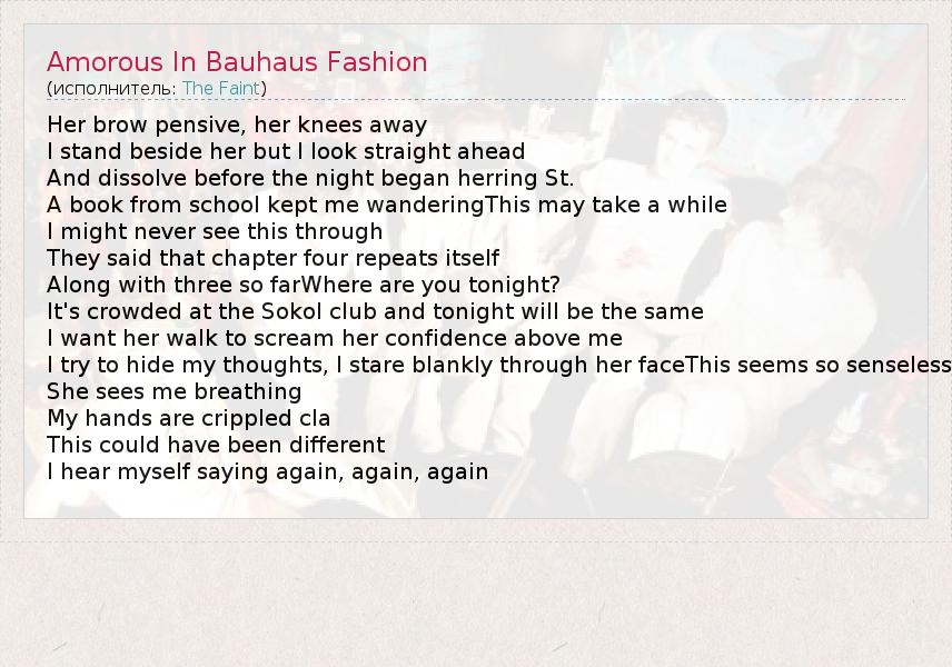 А как ты думаешь, о чем песня "Amorous In Bauhaus Fashion" ?