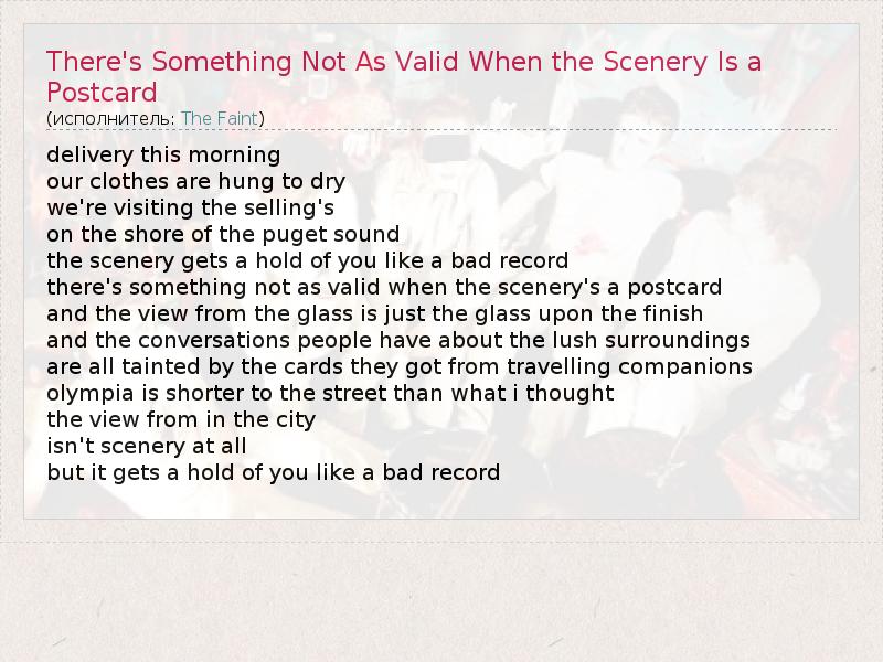 А как ты думаешь, о чем песня "There's Something Not As Valid When the Scenery Is a Postcard" ?