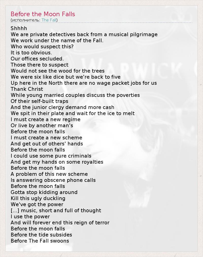 ГлавнаяИсполнителиThe FallBefore the Moon Falls