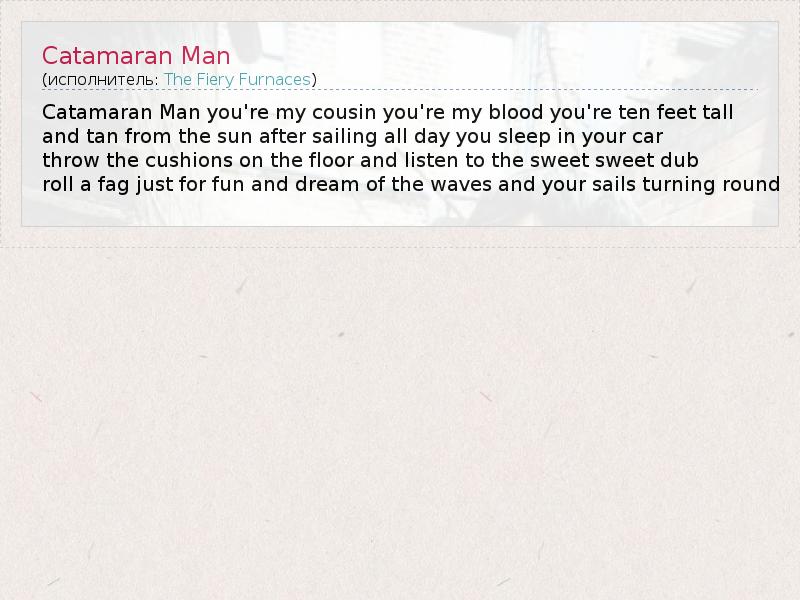 А как ты думаешь, о чем песня "Catamaran Man" ?