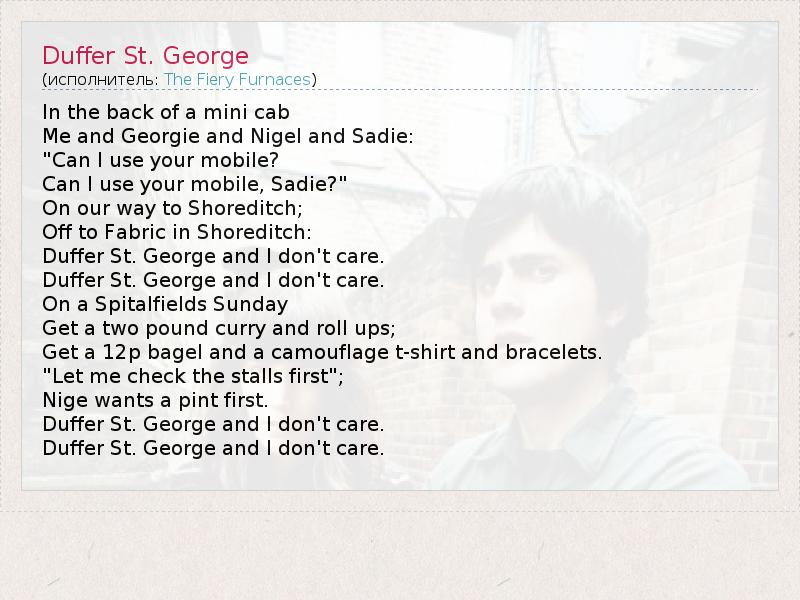 А как ты думаешь, о чем песня "Duffer St. George" ?