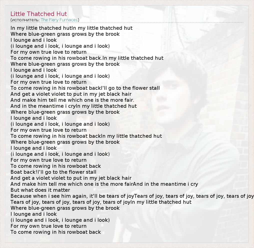 In my little thatched hutIn my little thatched hut Where blue-green grass grows by the brook I lounge and i look (i lounge and i look, i lounge and i look) For my own true love to return To come rowing in his rowboat back.In my little thatched hut Where blue-green grass grows by the brook I lounge and i look (i lounge and i look, i lounge and i look) For my own true love to return To come rowing in his rowboat backI'll go to the flower stall And get a violet violet to put in my jet black hair And make him tell me which one is the more fair. And in the meantime i cryIn my little thatched hut Where blue-green grass grows by the brook I lounge and i look (i lounge and i look, i lounge and i look) For my own true love to return To come rowing in his rowboat backIn my little thatched hut Where blue-green grass grows by the brook I lounge and i look (i lounge and i look, i lounge and i look) For my own true love to return To come rowing in his rowboat back Boat back!I'll go to the flower stall And get a violet violet to put in my jet black hair And make him tell me which one is the more fairAnd in the meantime i cry But what does it matter Because when i see him again, it'll be tears of joyTears of joy, tears of joy, tears of joy, tears of joy Tears of joy, tears of joy, tears of joy, tears of joyIn my little thatched hut Where blue-green grass grows by the brook I lounge and i look (i lounge and i look, i lounge and i look) For my own true love to return To come rowing in his rowboat back