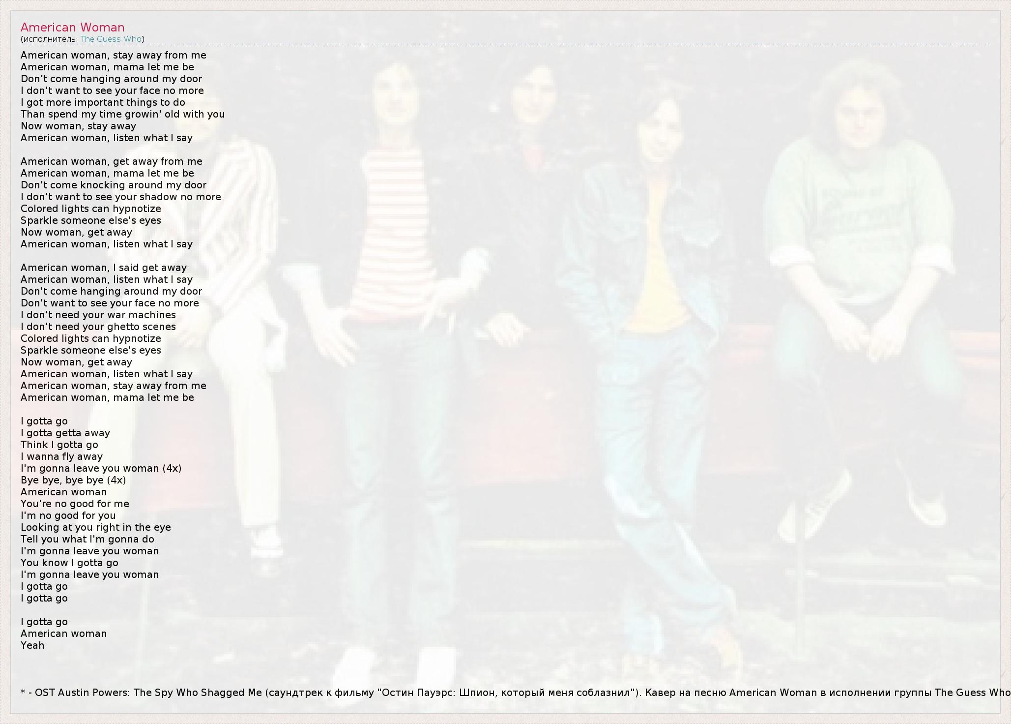 American woman, stay away from me American woman, mama let me be Don't come hanging around my door I don't want to see your face no more I got more important things to do Than spend my time growin' old with you Now woman, stay away American woman, listen what I say American woman, get away from me American woman, mama let me be Don't come knocking around my door I don't want to see your shadow no more Colored lights can hypnotize Sparkle someone else's eyes Now woman, get away American woman, listen what I say American woman, I said get away American woman, listen what I say Don't come hanging around my door Don't want to see your face no more I don't need your war machines I don't need your ghetto scenes Colored lights can hypnotize Sparkle someone else's eyes Now woman, get away American woman, listen what I say American woman, stay away from me American woman, mama let me be I gotta go I gotta getta away Think I gotta go I wanna fly away I'm gonna leave you woman (4x) Bye bye, bye bye (4x) American woman You're no good for me I'm no good for you Looking at you right in the eye Tell you what I'm gonna do I'm gonna leave you woman You know I gotta go I'm gonna leave you woman I gotta go I gotta go I gotta go American woman Yeah * - OST Austin Powers: The Spy Who Shagged Me (саундтрек к фильму "Остин Пауэрс: Шпион, который меня соблазнил"). Кавер на песню American Woman в исполнении группы The Guess Who