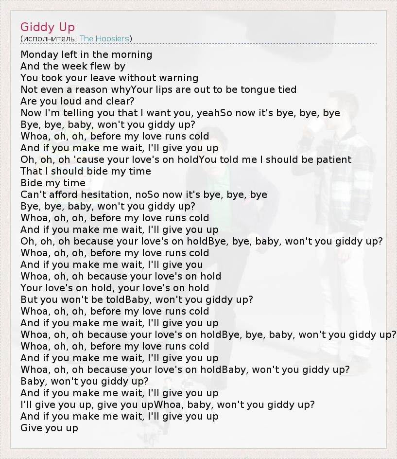 I'll give you up, give you upWhoa, baby, won't you giddy up?