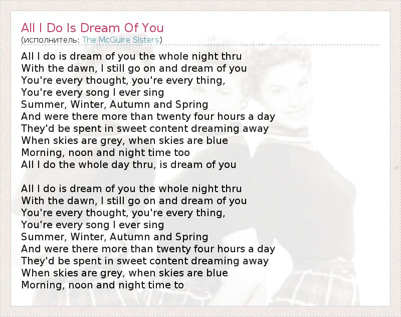 All I do is dream of you the whole night thru With the dawn, I still go on and dream of you You're every thought, you're every thing, You're every song I ever sing Summer, Winter, Autumn and Spring And were there more than twenty four hours a day They'd be spent in sweet content dreaming away When skies are grey, when skies are blue Morning, noon and night time too All I do the whole day thru, is dream of you All I do is dream of you the whole night thru With the dawn, I still go on and dream of you You're every thought, you're every thing, You're every song I ever sing Summer, Winter, Autumn and Spring And were there more than twenty four hours a day They'd be spent in sweet content dreaming away When skies are grey, when skies are blue Morning, noon and night time to
