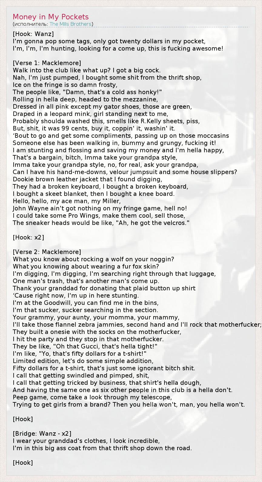 А как ты думаешь, о чем песня "Money in My Pockets" ?