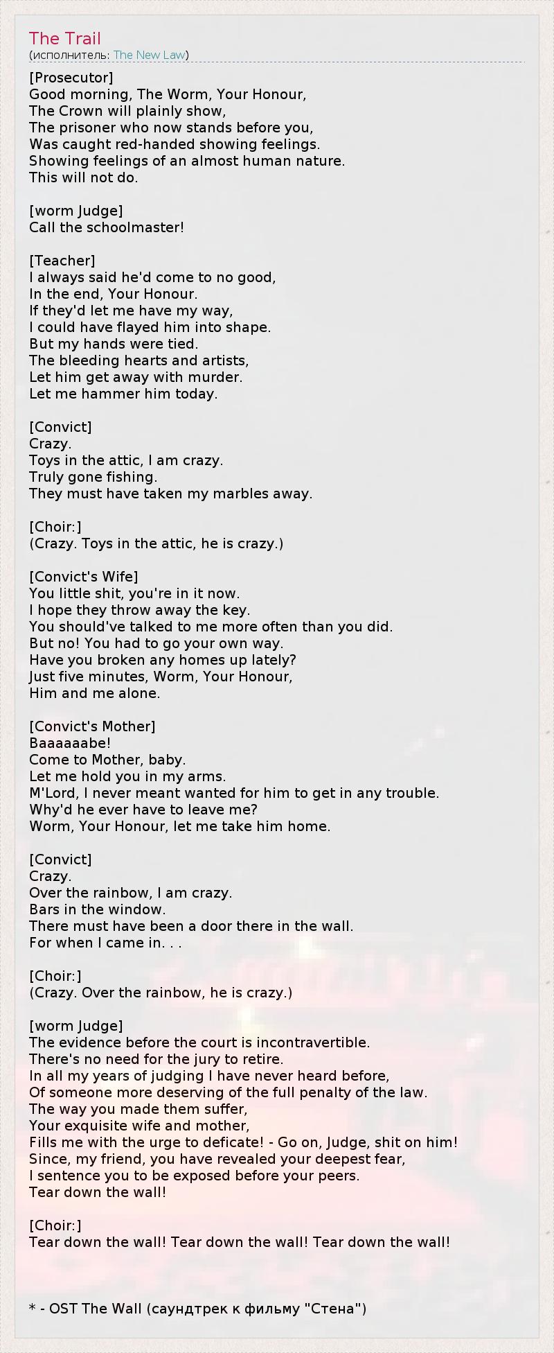 [Обвинитель]: Доброе утро, Червь, Ваша Честь, Венок ясно укажет на Узника, стоящего сейчас перед вами, Пойманного на месте преступления, проявляя переживания. Проявляя переживания почти что по-человечески. Но этому не бывать. [Червь-судья]: Позовите школьного учителя! [Учитель]: Я всегда говорил, что он плохо кончит, Ваша Честь. Если бы мне дали волю, Уж я-то мог бы содрать с него шкуру. Но мои руки были связаны. Из-за сердобольных и людей искусства Ему всё сходило с рук. Позвольте мне сегодня втолковать ему... [Подсудимый]: Безумец. Крыша поехала, я безумец. Искренне собиравшийся порыбачить. Должно быть, они забрали мои бирюльки. [Хор]: Безумец. Крыша поехала, он безумец. [Жена подсудимого]: Ты - дрянь, теперь они заперли тебя, И надеюсь, не собираются выпускать. Тебе следовало говорить со мной чаще. Но нет! Ты был вынужден идти своим путем. Сделал ли ты хоть что-нибудь полезное за последнее время? Дайте только пять минут, Червь, Ваша Честь, Ему и мне наедине. [Мать подсудимого]: Деточка-а-а-а-а-а! Иди к матери, дитя, Дай-ка я обниму тебя. Господи, я никогда не хотела, чтобы он вляпывался в неприятности. Зачем же ему пришлось покинуть меня? Червь, Ваша Честь, позвольте мне отвести его домой. [Подсудимый]: Безумец. Сидящий радуге, я безумец. Решётка на окне. Должна же быть дверь там, в стене. Ибо я когда-то смог войти... [Хор]: Безумец, сидящий радуге, он безумец. [Червь-судья]: Свидетельства представленные суду неопровержимы. Нет необходимости в совещании присяжных. За все мои годы судейства, мне никогда прежде не приходилось слышать О ком-то, более заслуживающем наказания по всей строгости закона. Способ, которым ты заставил их страдать, Свою изящную жену и мать, Наполняет меня побуждениями опорожниться! [Голос из зала]: Вперёд, Судья, обосри-ка его! С того момента, мой друг, как ты обнаружил свои глубочайшие страхи, Я приговариваю тебя разоблачиться перед равными по положению. Сокруши стену! [Хор]: Сокруши стену! Сокруши стену! Сокруши стену!..