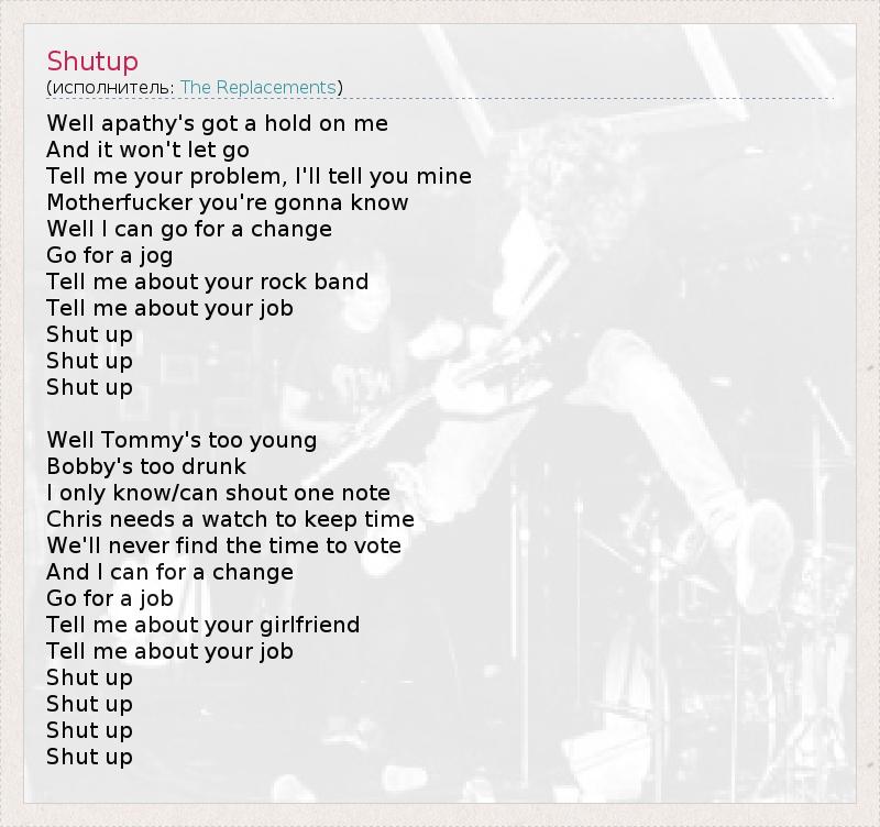 Well apathy's got a hold on me And it won't let go Tell me your problem, I'll tell you mine Motherfucker you're gonna know Well I can go for a change Go for a jog Tell me about your rock band Tell me about your job Shut up Shut up Shut up Well Tommy's too young Bobby's too drunk I only know/can shout one note Chris needs a watch to keep time We'll never find the time to vote And I can for a change Go for a job Tell me about your girlfriend Tell me about your job Shut up Shut up Shut up Shut up