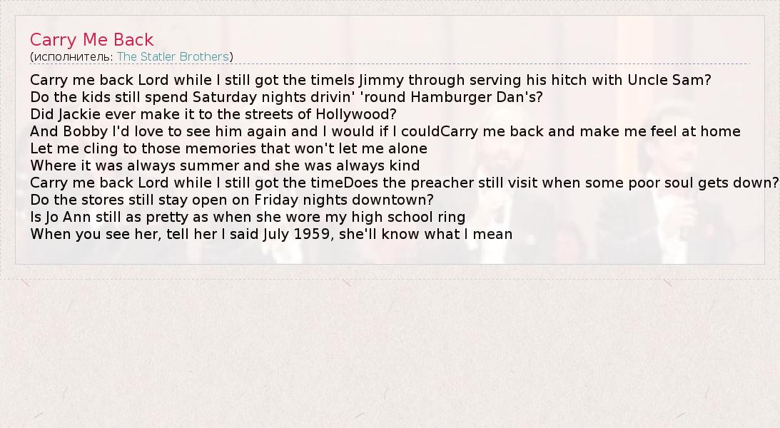 Это интересно:The Statler Brothers - это американский музыкальный квартет, основанный в 1955 г., в городе Стонтон, штат Вирджиния (США).Statler Brothers изначально исполняли госпел в местных церквях. Несмотря на название группы, только два члена The Statler Brothers (Дон и Гарольд Рид) настоящие братья. Ни у одного из остальных нет фамилии "Statler". <<<<<<< History >>>>>>>Когда у группы еще не было названия,... продолжение