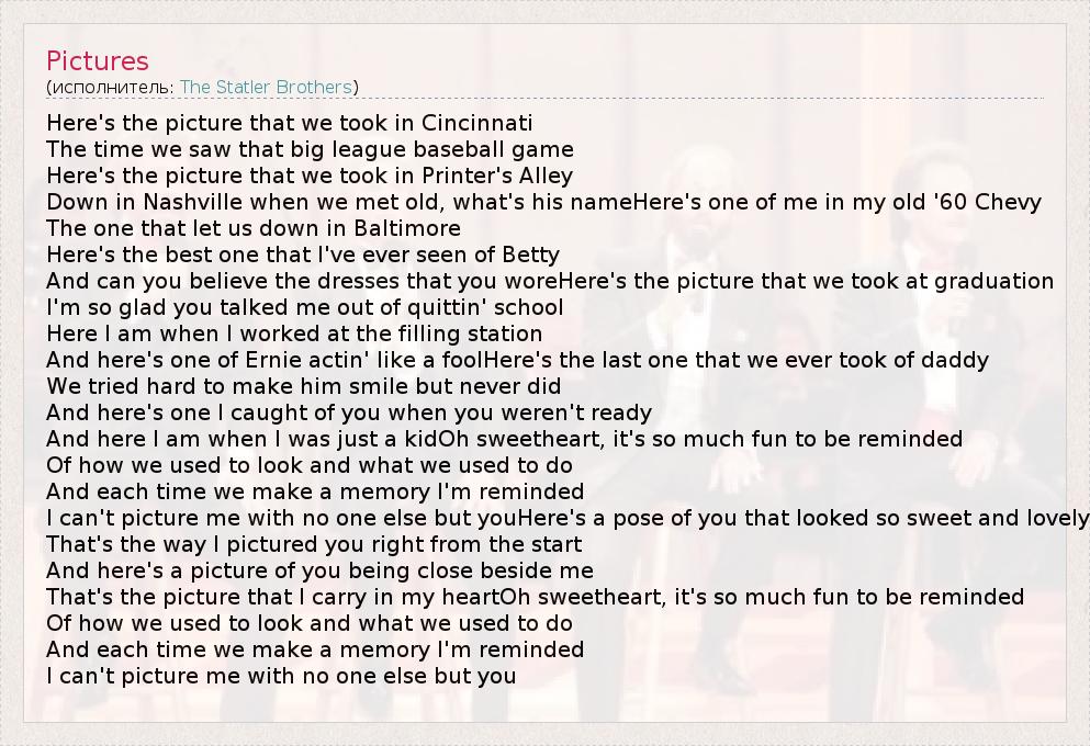 Here's the picture that we took in Cincinnati The time we saw that big league baseball game Here's the picture that we took in Printer's Alley Down in Nashville when we met old, what's his nameHere's one of me in my old '60 Chevy The one that let us down in Baltimore Here's the best one that I've ever seen of Betty And can you believe the dresses that you woreHere's the picture that we took at graduation I'm so glad you talked me out of quittin' school Here I am when I worked at the filling station And here's one of Ernie actin' like a foolHere's the last one that we ever took of daddy We tried hard to make him smile but never did And here's one I caught of you when you weren't ready And here I am when I was just a kidOh sweetheart, it's so much fun to be reminded Of how we used to look and what we used to do And each time we make a memory I'm reminded I can't picture me with no one else but youHere's a pose of you that looked so sweet and lovely That's the way I pictured you right from the start And here's a picture of you being close beside me That's the picture that I carry in my heartOh sweetheart, it's so much fun to be reminded Of how we used to look and what we used to do And each time we make a memory I'm reminded I can't picture me with no one else but you
