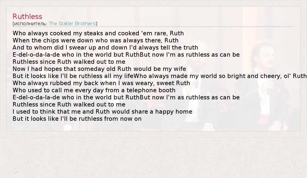 Who always cooked my steaks and cooked 'em rare, Ruth When the chips were down who was always there, Ruth And to whom did I swear up and down I'd always tell the truth E-del-o-da-la-de who in the world but RuthBut now I'm as ruthless as can be Ruthless since Ruth walked out to me Now I had hopes that someday old Ruth would be my wife But it looks like I'll be ruthless all my lifeWho always made my world so bright and cheery, ol' Ruth Who always rubbed my back when I was weary, sweet Ruth Who used to call me every day from a telephone booth E-del-o-da-la-de who in the world but RuthBut now I'm as ruthless as can be Ruthless since Ruth walked out to me I used to think that me and Ruth would share a happy home But it looks like I'll be ruthless from now on
