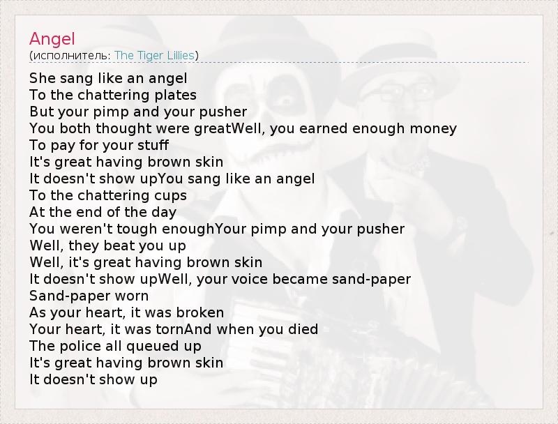 Это интересно:Tiger Lillies (Та́йгер Ли́ллиз, в пер. с англ. «тигровые лилии») — музыкальное трио из Лондона (Великобритания), основанное в 1989 году и активное по сей день.Трио работает в мрачном комедийно-трагичном стиле театра Grand Guignol с элементами брехтовского кабаре и чёрного юмора. Тексты песен нередко связаны с темами разных форм секса и смерти, среди героев песен — проститутки, извращенцы и наркоманы.... продолжение