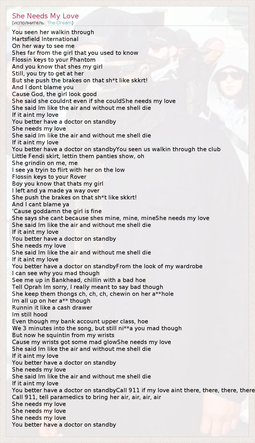 Это интересно:Terius Youngdell Nash - американский автор и исполнитель песен в жанре R&B и продюсер, скрывающийся под псевдонимом The-Dream. Родился в Северной Каролине, но рос в Атланте. Нэш является автором песни Umbrella, которую исполняет певица Рианна . После успеха этой композиции, Нэш стал активно работать... продолжение