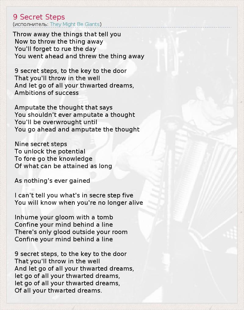 А как ты думаешь, о чем песня "9 Secret Steps" ?