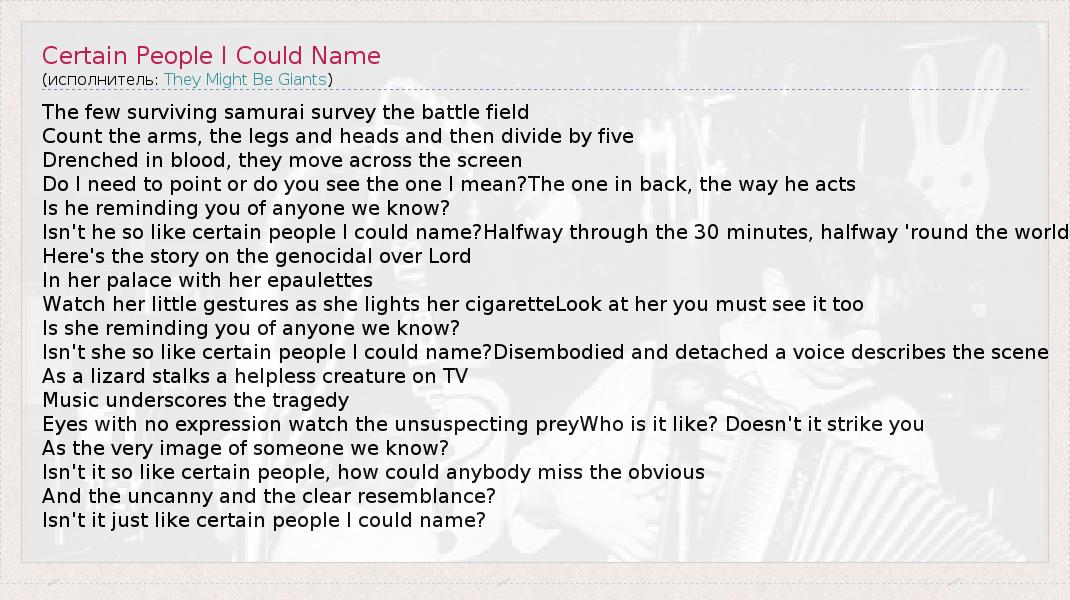 А как ты думаешь, о чем песня "Certain People I Could Name" ?