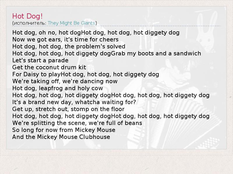 Hot dog, oh no, hot dogHot dog, hot dog, hot diggety dog Now we got ears, it's time for cheers Hot dog, hot dog, the problem's solved Hot dog, hot dog, hot diggety dogGrab my boots and a sandwich Let's start a parade Get the coconut drum kit For Daisy to playHot dog, hot dog, hot diggety dog We're taking off, we're dancing now Hot dog, leapfrog and holy cow Hot dog, hot dog, hot diggety dogHot dog, hot dog, hot diggety dog It's a brand new day, whatcha waiting for? Get up, stretch out, stomp on the floor Hot dog, hot dog, hot diggety dogHot dog, hot dog, hot diggety dog We're splitting the scene, we're full of beans So long for now from Mickey Mouse And the Mickey Mouse Clubhouse