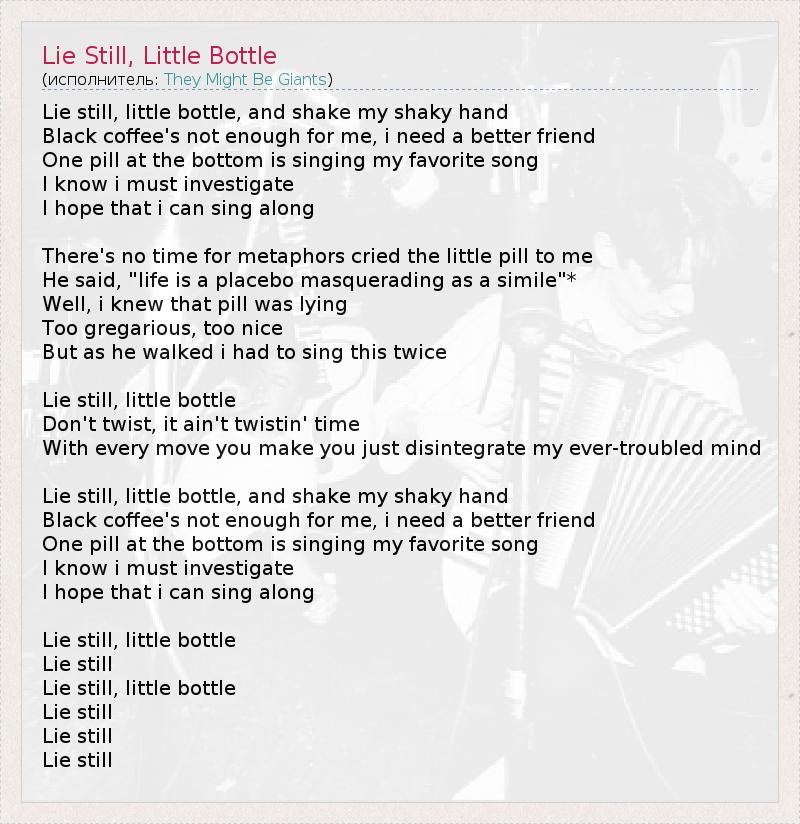 Lie still, little bottle, and shake my shaky hand Black coffee's not enough for me, i need a better friend One pill at the bottom is singing my favorite song I know i must investigate I hope that i can sing along There's no time for metaphors cried the little pill to me He said, "life is a placebo masquerading as a simile"* Well, i knew that pill was lying Too gregarious, too nice But as he walked i had to sing this twice Lie still, little bottle Don't twist, it ain't twistin' time With every move you make you just disintegrate my ever-troubled mind Lie still, little bottle, and shake my shaky hand Black coffee's not enough for me, i need a better friend One pill at the bottom is singing my favorite song I know i must investigate I hope that i can sing along Lie still, little bottle Lie still Lie still, little bottle Lie still Lie still Lie still