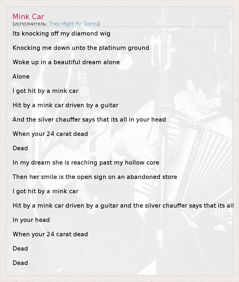 Its knocking off my diamond wig Knocking me down unto the platinum ground Woke up in a beautiful dream alone Alone I got hit by a mink car Hit by a mink car driven by a guitar And the silver chauffer says that its all in your head When your 24 carat dead Dead In my dream she is reaching past my hollow core Then her smile is the open sign on an abandoned store I got hit by a mink car Hit by a mink car driven by a guitar and the silver chauffer says that its all In your head When your 24 carat dead Dead Dead