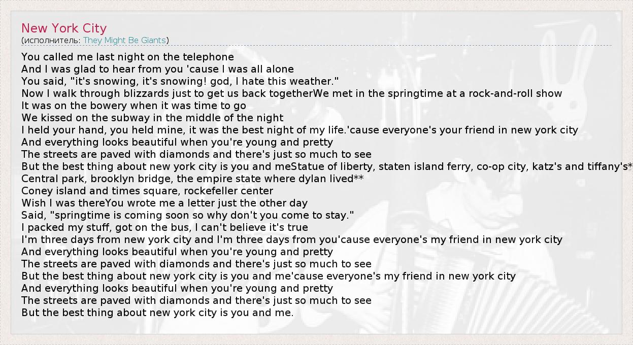 But the best thing about new york city is you and me'cause everyone's my friend in new york city