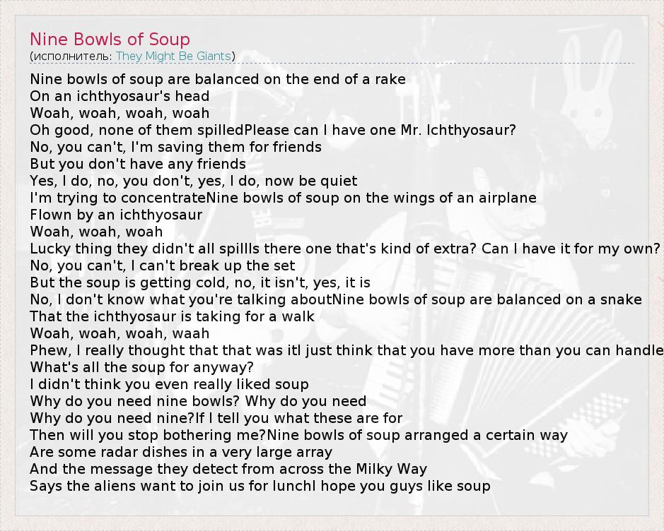 А как ты думаешь, о чем песня "Nine Bowls of Soup" ?