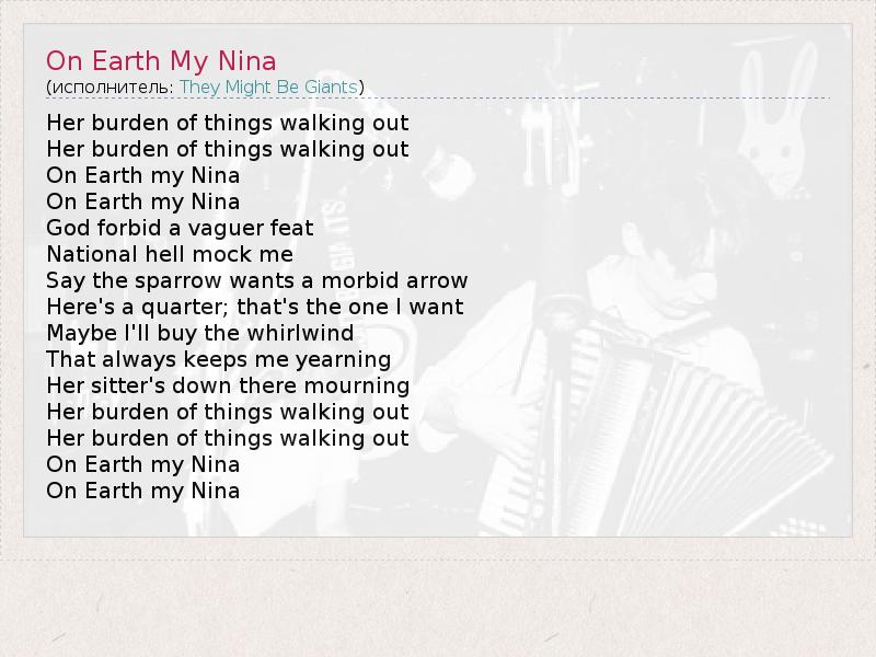 А как ты думаешь, о чем песня "On Earth My Nina" ?
