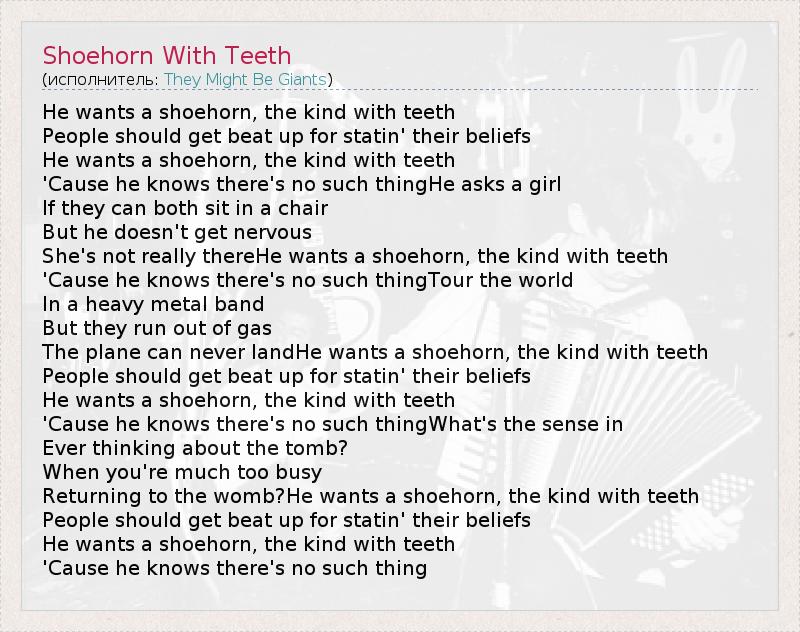 А как ты думаешь, о чем песня "Shoehorn With Teeth" ?