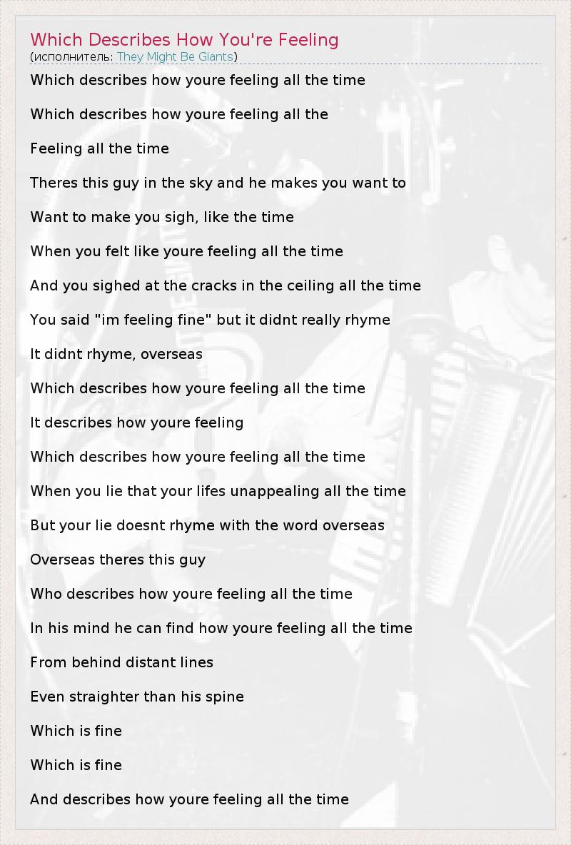 Which describes how youre feeling all the time Which describes how youre feeling all the Feeling all the time Theres this guy in the sky and he makes you want to Want to make you sigh, like the time When you felt like youre feeling all the time And you sighed at the cracks in the ceiling all the time You said "im feeling fine" but it didnt really rhyme It didnt rhyme, overseas Which describes how youre feeling all the time It describes how youre feeling Which describes how youre feeling all the time When you lie that your lifes unappealing all the time But your lie doesnt rhyme with the word overseas Overseas theres this guy Who describes how youre feeling all the time In his mind he can find how youre feeling all the time From behind distant lines Even straighter than his spine Which is fine Which is fine And describes how youre feeling all the time