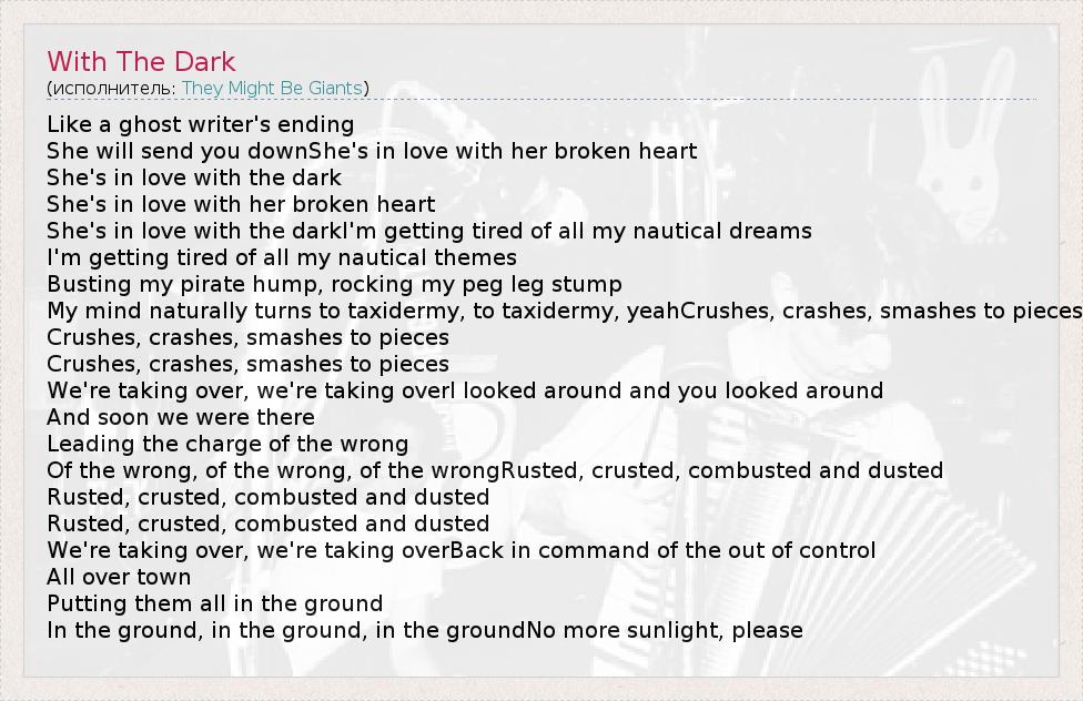 She's in love with the darkI'm getting tired of all my nautical dreams