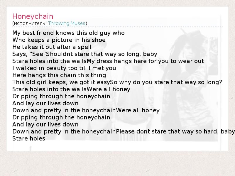Down and pretty in the honeychainPlease dont stare that way so hard, baby