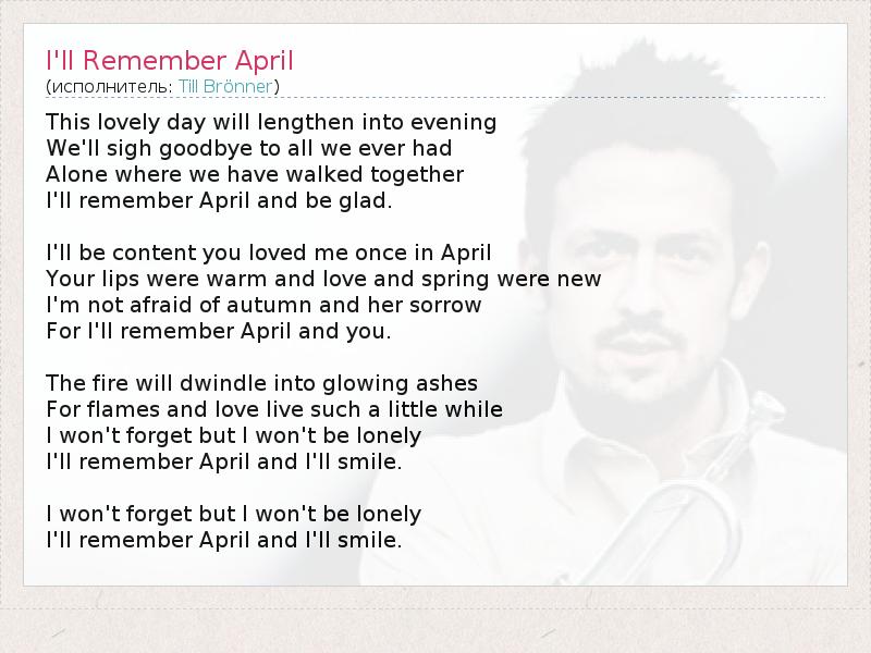 Этот пригожий день постепенно станет вечером, Мы вздохнем, прощаясь со всем, что у нас было, В одиночестве, там, где мы гуляли вдвоем, Я буду вспоминать апрель и я буду счастлив. Я обрадуюсь тому, что однажды ты меня любила в апреле, Твои губы были теплые, и любовь, и весна только начались, Я не боюсь осени и ее печали, Потому что я буду вспоминать апрель и тебя. Это пламя станет раскаленным пеплом, Потому что пламя и любовь живут так недолго, Я не позабуду, но я не буду одинок, Я буду вспоминать апрель и я буду улыбаться. Я не позабуду, но я не буду одинок, Я буду вспоминать апрель и я буду улыбаться.