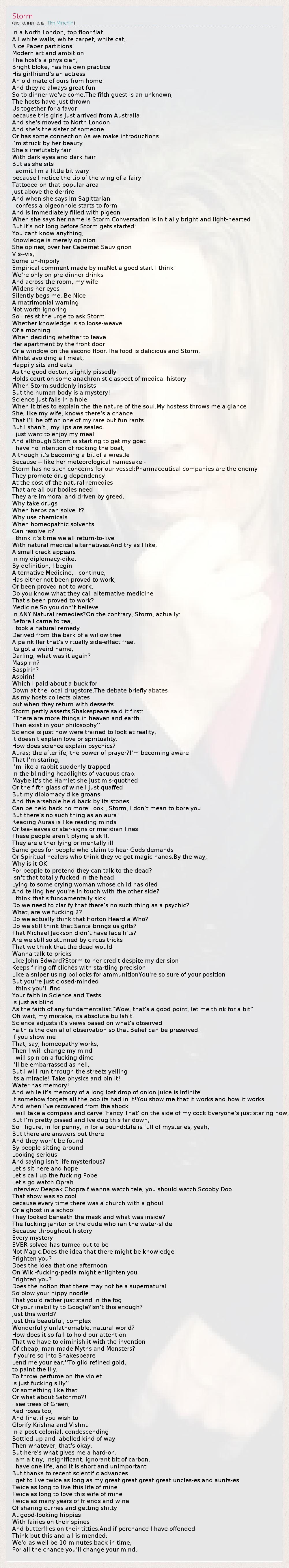 When it tries to explain the the nature of the soul.My hostess throws me a glance