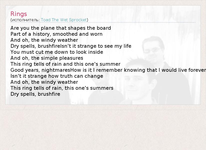 Это интересно:Toad the Wet Sprocket, американская альтернативная поп-рок-группа. Образована в 1986 в Санта-Барбаре, Калифорния. Группа была основана уроженцами Санта-Барбары, один из которых — Дин Диннинг — с рождения имел прямое отношение к музыке (его дядей был известный в 1950-е гг. «хит-мэйкер» Марк «Тин Энджел» Диннинг, Mark «Teen Angel» Dinning). После активных выступлений в городских барах, в 1988 группа записала демо-запись... продолжение