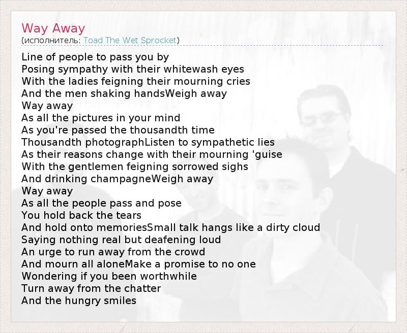 Это интересно:Toad the Wet Sprocket, американская альтернативная поп-рок-группа. Образована в 1986 в Санта-Барбаре, Калифорния. Группа была основана уроженцами Санта-Барбары, один из которых — Дин Диннинг — с рождения имел прямое отношение к музыке (его дядей был известный в 1950-е гг. «хит-мэйкер» Марк «Тин Энджел» Диннинг, Mark «Teen Angel» Dinning). После активных выступлений в городских барах, в 1988 группа записала демо-запись... продолжение