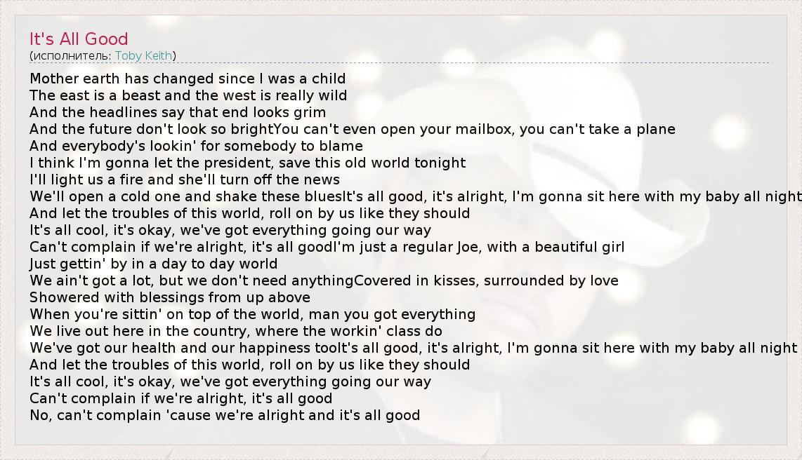 We've got our health and our happiness tooIt's all good, it's alright, I'm gonna sit here with my baby all night
