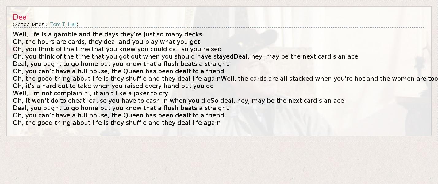 Well, life is a gamble and the days they're just so many decks Oh, the hours are cards, they deal and you play what you get Oh, you think of the time that you knew you could call so you raised Oh, you think of the time that you got out when you should have stayedDeal, hey, may be the next card's an ace Deal, you ought to go home but you know that a flush beats a straight Oh, you can't have a full house, the Queen has been dealt to a friend Oh, the good thing about life is they shuffle and they deal life againWell, the cards are all stacked when you're hot and the women are too Oh, it's a hard cut to take when you raised every hand but you do Well, I'm not complainin', it ain't like a joker to cry Oh, it won't do to cheat 'cause you have to cash in when you dieSo deal, hey, may be the next card's an ace Deal, you ought to go home but you know that a flush beats a straight Oh, you can't have a full house, the Queen has been dealt to a friend Oh, the good thing about life is they shuffle and they deal life again