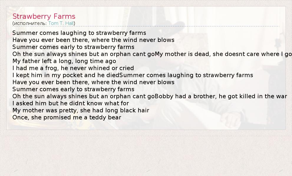 Summer comes laughing to strawberry farms Have you ever been there, where the wind never blows Summer comes early to strawberry farms Oh the sun always shines but an orphan cant goMy mother is dead, she doesnt care where I go My father left a long, long time ago I had me a frog, he never whined or cried I kept him in my pocket and he diedSummer comes laughing to strawberry farms Have you ever been there, where the wind never blows Summer comes early to strawberry farms Oh the sun always shines but an orphan cant goBobby had a brother, he got killed in the war I asked him but he didnt know what for My mother was pretty, she had long black hair Once, she promised me a teddy bear