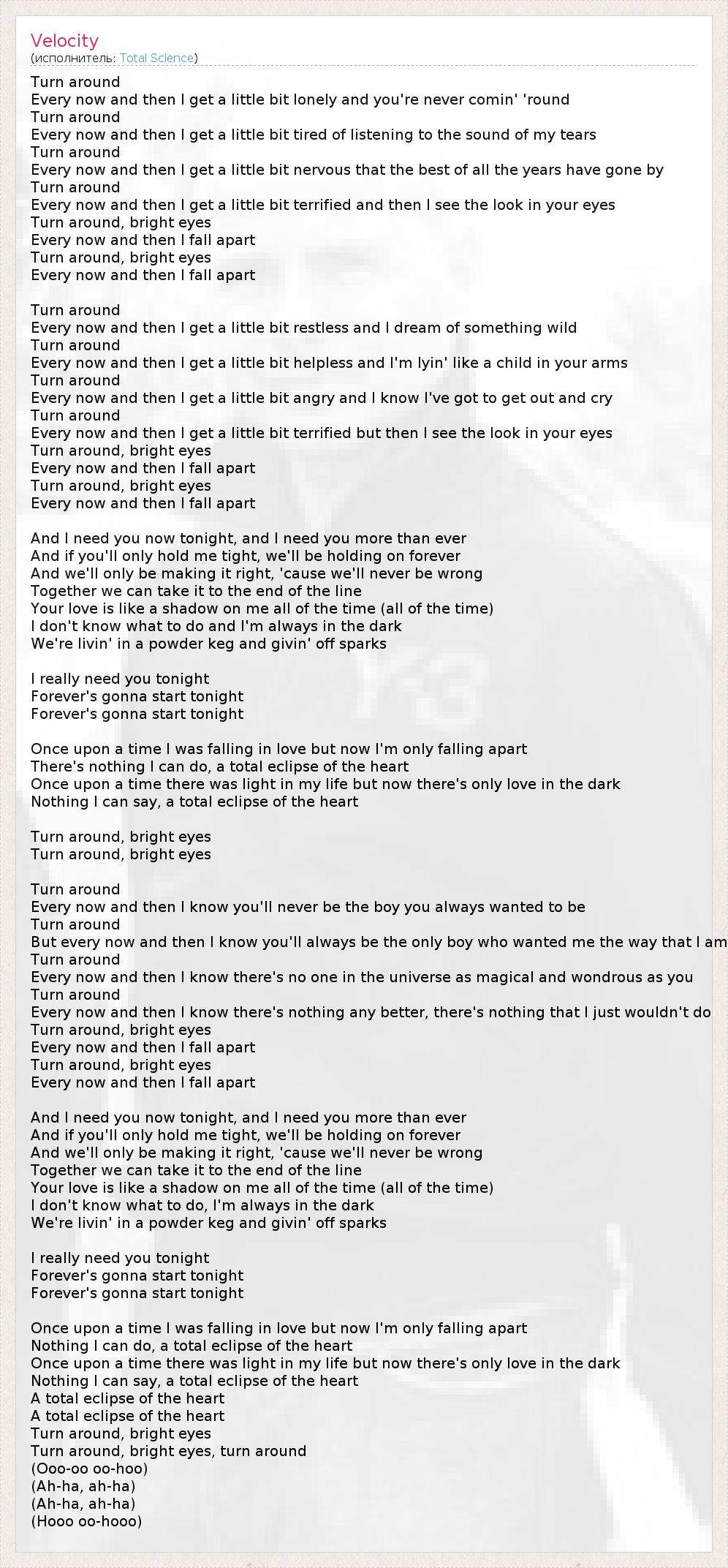 Turn around Every now and then I get a little bit lonely and you're never comin' 'round Turn around Every now and then I get a little bit tired of listening to the sound of my tears Turn around Every now and then I get a little bit nervous that the best of all the years have gone by Turn around Every now and then I get a little bit terrified and then I see the look in your eyes Turn around, bright eyes Every now and then I fall apart Turn around, bright eyes Every now and then I fall apart Turn around Every now and then I get a little bit restless and I dream of something wild Turn around Every now and then I get a little bit helpless and I'm lyin' like a child in your arms Turn around Every now and then I get a little bit angry and I know I've got to get out and cry Turn around Every now and then I get a little bit terrified but then I see the look in your eyes Turn around, bright eyes Every now and then I fall apart Turn around, bright eyes Every now and then I fall apart And I need you now tonight, and I need you more than ever And if you'll only hold me tight, we'll be holding on forever And we'll only be making it right, 'cause we'll never be wrong Together we can take it to the end of the line Your love is like a shadow on me all of the time (all of the time) I don't know what to do and I'm always in the dark We're livin' in a powder keg and givin' off sparks I really need you tonight Forever's gonna start tonight Forever's gonna start tonight Once upon a time I was falling in love but now I'm only falling apart There's nothing I can do, a total eclipse of the heart Once upon a time there was light in my life but now there's only love in the dark Nothing I can say, a total eclipse of the heart Turn around, bright eyes Turn around, bright eyes Turn around Every now and then I know you'll never be the boy you always wanted to be Turn around But every now and then I know you'll always be the only boy who wanted me the way that I am Turn around Every now and then I know there's no one in the universe as magical and wondrous as you Turn around Every now and then I know there's nothing any better, there's nothing that I just wouldn't do Turn around, bright eyes Every now and then I fall apart Turn around, bright eyes Every now and then I fall apart And I need you now tonight, and I need you more than ever And if you'll only hold me tight, we'll be holding on forever And we'll only be making it right, 'cause we'll never be wrong Together we can take it to the end of the line Your love is like a shadow on me all of the time (all of the time) I don't know what to do, I'm always in the dark We're livin' in a powder keg and givin' off sparks I really need you tonight Forever's gonna start tonight Forever's gonna start tonight Once upon a time I was falling in love but now I'm only falling apart Nothing I can do, a total eclipse of the heart Once upon a time there was light in my life but now there's only love in the dark Nothing I can say, a total eclipse of the heart A total eclipse of the heart A total eclipse of the heart Turn around, bright eyes Turn around, bright eyes, turn around (Ooo-oo oo-hoo) (Ah-ha, ah-ha) (Ah-ha, ah-ha) (Hooo oo-hooo)