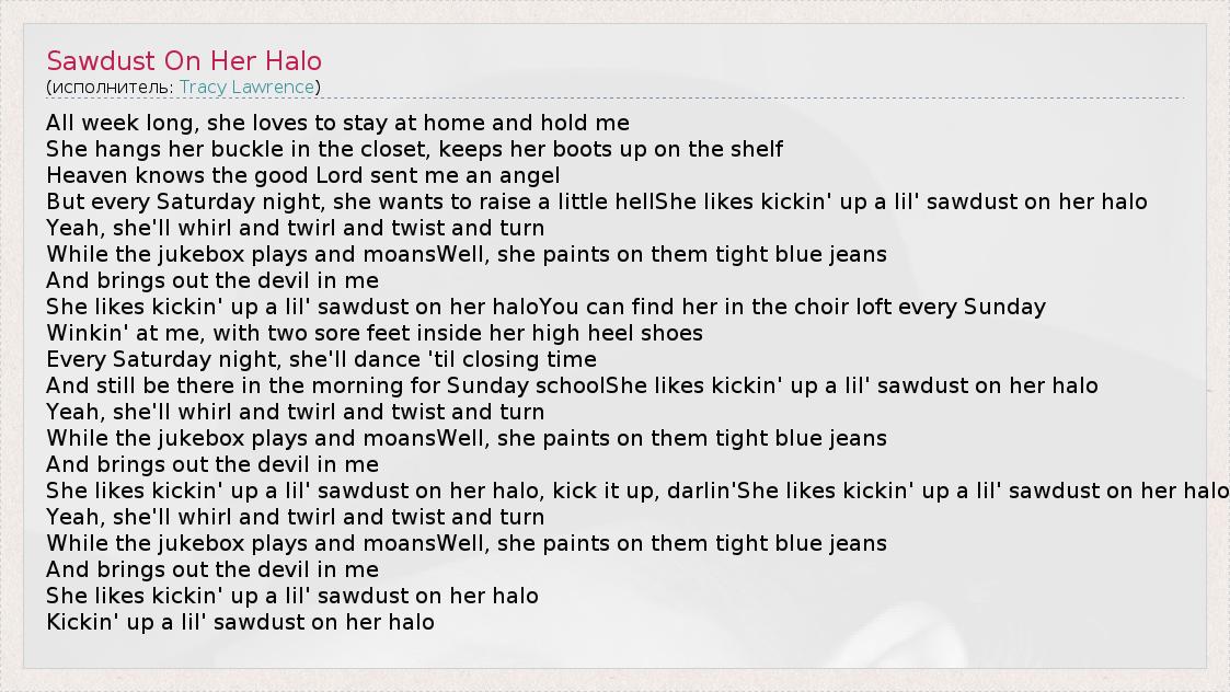 All week long, she loves to stay at home and hold me She hangs her buckle in the closet, keeps her boots up on the shelf Heaven knows the good Lord sent me an angel But every Saturday night, she wants to raise a little hellShe likes kickin' up a lil' sawdust on her halo Yeah, she'll whirl and twirl and twist and turn While the jukebox plays and moansWell, she paints on them tight blue jeans And brings out the devil in me She likes kickin' up a lil' sawdust on her haloYou can find her in the choir loft every Sunday Winkin' at me, with two sore feet inside her high heel shoes Every Saturday night, she'll dance 'til closing time And still be there in the morning for Sunday schoolShe likes kickin' up a lil' sawdust on her halo Yeah, she'll whirl and twirl and twist and turn While the jukebox plays and moansWell, she paints on them tight blue jeans And brings out the devil in me She likes kickin' up a lil' sawdust on her halo, kick it up, darlin'She likes kickin' up a lil' sawdust on her halo Yeah, she'll whirl and twirl and twist and turn While the jukebox plays and moansWell, she paints on them tight blue jeans And brings out the devil in me She likes kickin' up a lil' sawdust on her halo Kickin' up a lil' sawdust on her halo