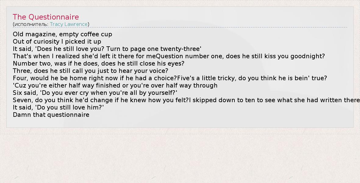 Old magazine, empty coffee cup Out of curiosity I picked it up It said, 'Does he still love you? Turn to page one twenty-three' That's when I realized she'd left it there for meQuestion number one, does he still kiss you goodnight? Number two, was if he does, does he still close his eyes? Three, does he still call you just to hear your voice? Four, would he be home right now if he had a choice?Five's a little tricky, do you think he is bein' true? 'Cuz you're either half way finished or you're over half way through Six said, 'Do you ever cry when you're all by yourself?' Seven, do you think he'd change if he knew how you felt?I skipped down to ten to see what she had written there It said, 'Do you still love him?' Damn that questionnaire