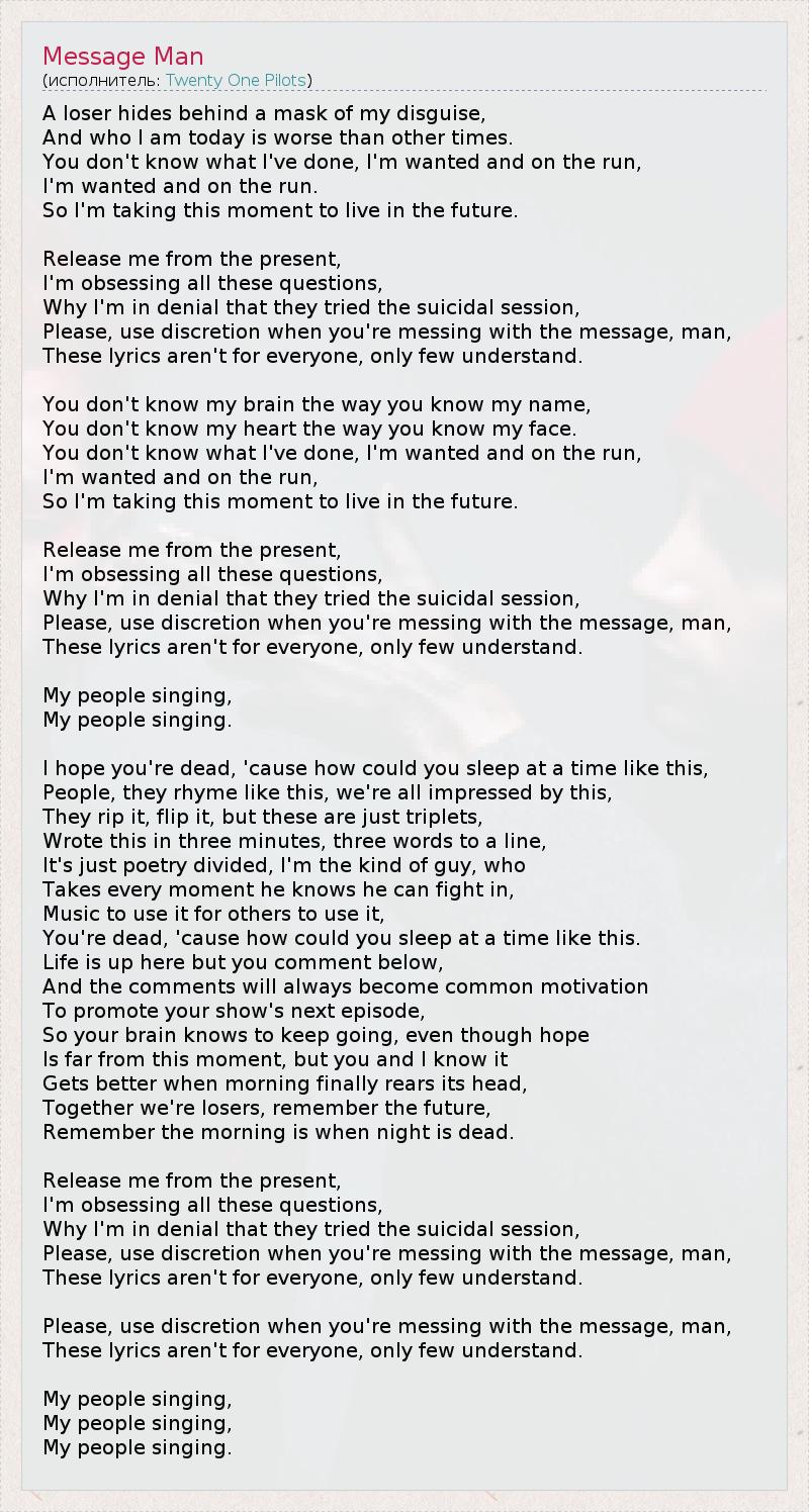 Неудачник скрывается под моей личиной, И тот, кто я сегодня, хуже, чем раньше. Ты не знаешь, что я натворил, меня разыскивают, я в бегах, Меня разыскивают, я в бегах, Так что я забираю это мгновение, чтобы прожить его в будущем. Выпустите меня из настоящего, Меня мучают эти вопросы, Почему я отрицаю, что они пробовали покончить с собой, Пожалуйста, проявляй осторожность, когда имеешь дело с посланием, чувак, Эти стихи не для всех, лишь немногие поймут. Ты не знаешь мой мозг так, как моё имя, Ты не знаешь моё сердце так, как моё лицо. Ты не знаешь, что я натворил, меня разыскивают, я в бегах, Меня разыскивают, я в бегах, Так что я забираю это мгновение, чтобы прожить его в будущем. Выпустите меня из настоящего, Меня мучают эти вопросы, Почему я отрицаю, что они пробовали покончить с собой, Пожалуйста, проявляй осторожность, когда имеешь дело с посланием, чувак, Эти стихи не для всех, лишь немногие поймут. Мой народ поёт, Мой народ поёт. Надеюсь, ты мёртв, иначе как можно спать в такое время? Люди, они рифмуют вот так, мы все под впечатлением, Они разрывают, переворачивают, но это лишь триплеты, Написал это за три минуты, по три слова на строку, Это просто рассечённая поэзия, я из тех парней, что Берут каждое мгновение, когда знают, что могут биться, И пользуются музыкой, чтобы ей воспользовались другие, Ты мёртв, иначе как можно спать в такое время. Жизнь здесь, вверху, но ты пишешь внизу комментарий, А мнения всегда становятся всеобщим стимулом, Чтобы продвинуть следующую серию своего сериала, Так твой мозг понимает, что надо продолжать, хотя надежда Далеко отсюда, но ты и я знаем, что Станет лучше, когда утро, наконец, поднимет голову, Вместе мы неудачники, помни о будущем, Помни: утро — это, когда ночь умирает. Выпустите меня из настоящего, Меня мучают эти вопросы, Почему я отрицаю, что они пробовали покончить с собой, Пожалуйста, проявляй осторожность, когда имеешь дело с посланием, чувак, Эти стихи не для всех, лишь немногие поймут. Пожалуйста, проявляй осторожность, когда имеешь дело с посланием, чувак, Эти стихи не для всех, лишь немногие поймут. Мой народ поёт, Мой народ поёт, Мой народ поёт.