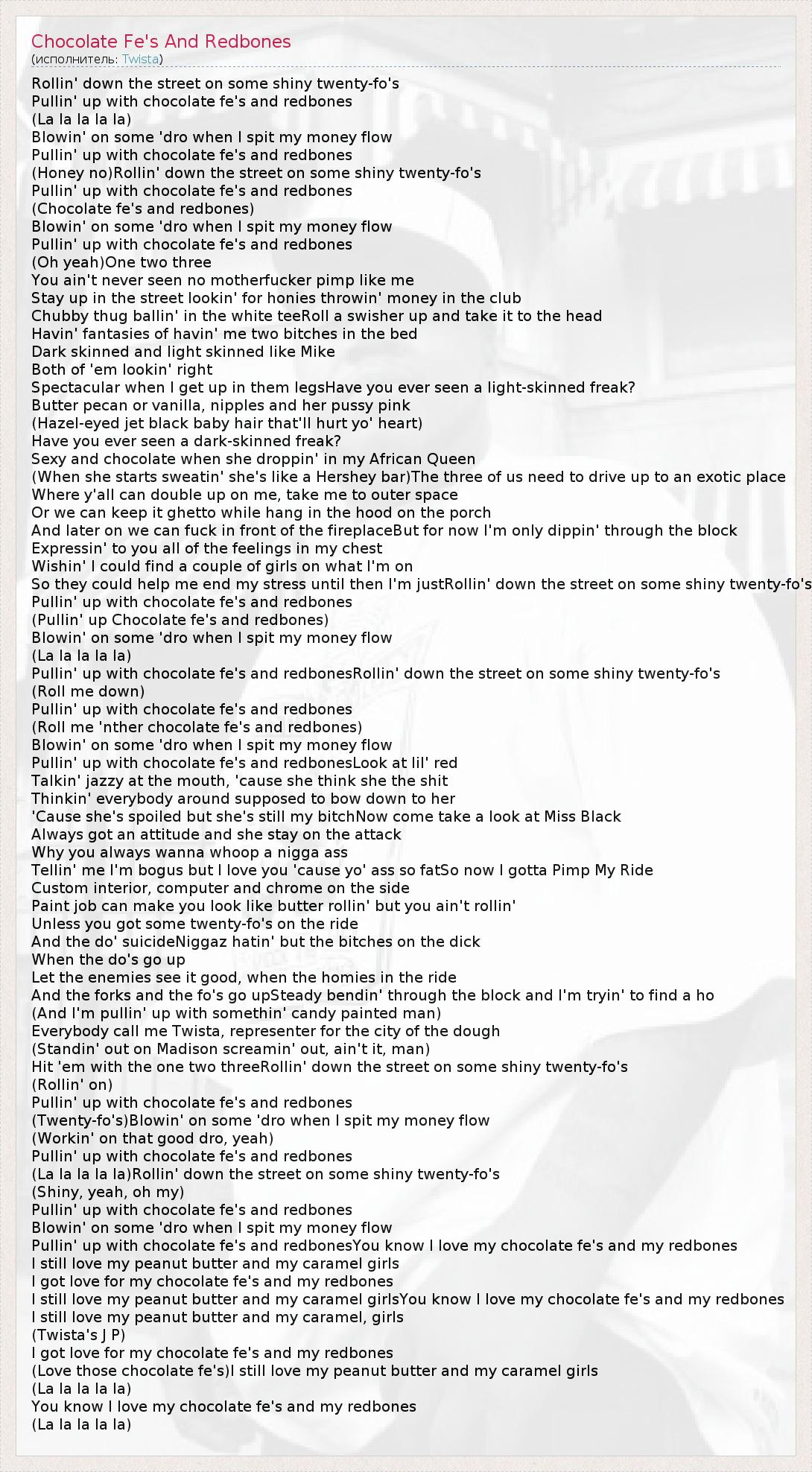 Rollin' down the street on some shiny twenty-fo's Pullin' up with chocolate fe's and redbones (La la la la la) Blowin' on some 'dro when I spit my money flow Pullin' up with chocolate fe's and redbones (Honey no)Rollin' down the street on some shiny twenty-fo's Pullin' up with chocolate fe's and redbones (Chocolate fe's and redbones) Blowin' on some 'dro when I spit my money flow Pullin' up with chocolate fe's and redbones (Oh yeah)One two three You ain't never seen no motherfucker pimp like me Stay up in the street lookin' for honies throwin' money in the club Chubby thug ballin' in the white teeRoll a swisher up and take it to the head Havin' fantasies of havin' me two bitches in the bed Dark skinned and light skinned like Mike Both of 'em lookin' right Spectacular when I get up in them legsHave you ever seen a light-skinned freak? Butter pecan or vanilla, nipples and her pussy pink (Hazel-eyed jet black baby hair that'll hurt yo' heart) Have you ever seen a dark-skinned freak? Sexy and chocolate when she droppin' in my African Queen (When she starts sweatin' she's like a Hershey bar)The three of us need to drive up to an exotic place Where y'all can double up on me, take me to outer space Or we can keep it ghetto while hang in the hood on the porch And later on we can fuck in front of the fireplaceBut for now I'm only dippin' through the block Expressin' to you all of the feelings in my chest Wishin' I could find a couple of girls on what I'm on So they could help me end my stress until then I'm justRollin' down the street on some shiny twenty-fo's Pullin' up with chocolate fe's and redbones (Pullin' up Chocolate fe's and redbones) Blowin' on some 'dro when I spit my money flow (La la la la la) Pullin' up with chocolate fe's and redbonesRollin' down the street on some shiny twenty-fo's (Roll me down) Pullin' up with chocolate fe's and redbones (Roll me 'nther chocolate fe's and redbones) Blowin' on some 'dro when I spit my money flow Pullin' up with chocolate fe's and redbonesLook at lil' red Talkin' jazzy at the mouth, 'cause she think she the shit Thinkin' everybody around supposed to bow down to her 'Cause she's spoiled but she's still my bitchNow come take a look at Miss Black Always got an attitude and she stay on the attack Why you always wanna whoop a nigga ass Tellin' me I'm bogus but I love you 'cause yo' ass so fatSo now I gotta Pimp My Ride Custom interior, computer and chrome on the side Paint job can make you look like butter rollin' but you ain't rollin' Unless you got some twenty-fo's on the ride And the do' suicideNiggaz hatin' but the bitches on the dick When the do's go up Let the enemies see it good, when the homies in the ride And the forks and the fo's go upSteady bendin' through the block and I'm tryin' to find a ho (And I'm pullin' up with somethin' candy painted man) Everybody call me Twista, representer for the city of the dough (Standin' out on Madison screamin' out, ain't it, man) Hit 'em with the one two threeRollin' down the street on some shiny twenty-fo's (Rollin' on) Pullin' up with chocolate fe's and redbones (Twenty-fo's)Blowin' on some 'dro when I spit my money flow (Workin' on that good dro, yeah) Pullin' up with chocolate fe's and redbones (La la la la la)Rollin' down the street on some shiny twenty-fo's (Shiny, yeah, oh my) Pullin' up with chocolate fe's and redbones Blowin' on some 'dro when I spit my money flow Pullin' up with chocolate fe's and redbonesYou know I love my chocolate fe's and my redbones I still love my peanut butter and my caramel girls I got love for my chocolate fe's and my redbones I still love my peanut butter and my caramel girlsYou know I love my chocolate fe's and my redbones I still love my peanut butter and my caramel, girls (Twista's J P) I got love for my chocolate fe's and my redbones (Love those chocolate fe's)I still love my peanut butter and my caramel girls (La la la la la) You know I love my chocolate fe's and my redbones (La la la la la)