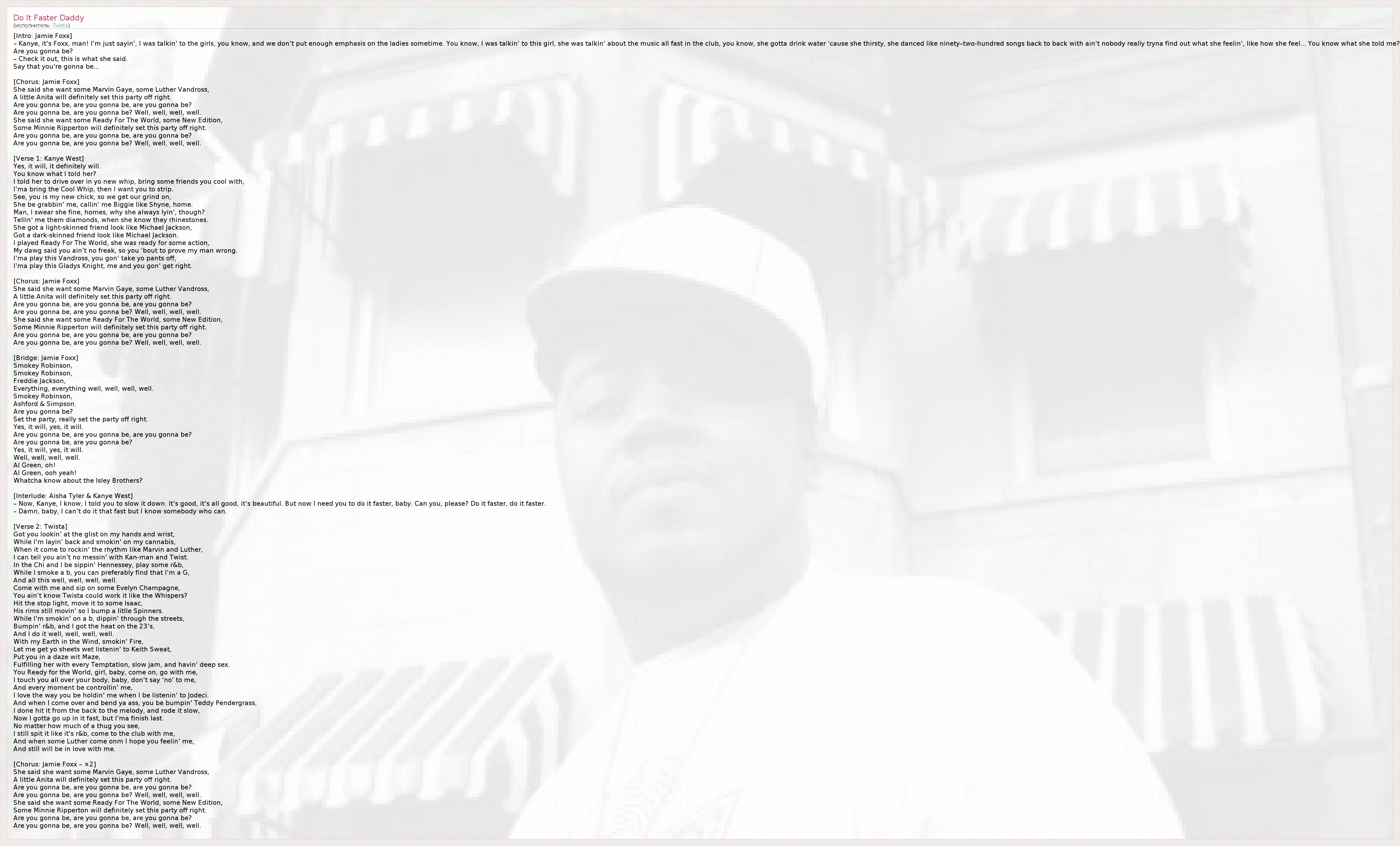 [Intro: Jamie Foxx] – Kanye, it's Foxx, man! I'm just sayin', I was talkin' to the girls, you know, and we don't put enough emphasis on the ladies sometime. You know, I was talkin' to this girl, she was talkin' about the music all fast in the club, you know, she gotta drink water ‘cause she thirsty, she danced like ninety–two-hundred songs back to back with ain't nobody really tryna find out what she feelin', like how she feel... You know what she told me? Are you gonna be? – Check it out, this is what she said. Say that you're gonna be... [Chorus: Jamie Foxx] She said she want some Marvin Gaye, some Luther Vandross, A little Anita will definitely set this party off right. Are you gonna be, are you gonna be, are you gonna be? Are you gonna be, are you gonna be? Well, well, well, well. She said she want some Ready For The World, some New Edition, Some Minnie Ripperton will definitely set this party off right. Are you gonna be, are you gonna be, are you gonna be? Are you gonna be, are you gonna be? Well, well, well, well. [Verse 1: Kanye West] Yes, it will, it definitely will. You know what I told her? I told her to drive over in yo new whip, bring some friends you cool with, I'ma bring the Cool Whip, then I want you to strip. See, you is my new chick, so we get our grind on, She be grabbin' me, callin' me Biggie like Shyne, home. Man, I swear she fine, homes, why she always lyin', though? Tellin' me them diamonds, when she know they rhinestones. She got a light-skinned friend look like Michael Jackson, Got a dark-skinned friend look like Michael Jackson. I played Ready For The World, she was ready for some action, My dawg said you ain't no freak, so you ‘bout to prove my man wrong. I'ma play this Vandross, you gon' take yo pants off, I'ma play this Gladys Knight, me and you gon' get right. [Chorus: Jamie Foxx] She said she want some Marvin Gaye, some Luther Vandross, A little Anita will definitely set this party off right. Are you gonna be, are you gonna be, are you gonna be? Are you gonna be, are you gonna be? Well, well, well, well. She said she want some Ready For The World, some New Edition, Some Minnie Ripperton will definitely set this party off right. Are you gonna be, are you gonna be, are you gonna be? Are you gonna be, are you gonna be? Well, well, well, well. [Bridge: Jamie Foxx] Smokey Robinson, Smokey Robinson, Freddie Jackson, Everything, everything well, well, well, well. Smokey Robinson, Ashford & Simpson. Are you gonna be? Set the party, really set the party off right. Yes, it will, yes, it will. Are you gonna be, are you gonna be, are you gonna be? Are you gonna be, are you gonna be? Yes, it will, yes, it will. Well, well, well, well. Al Green, oh! Al Green, ooh yeah! Whatcha know about the Isley Brothers? [Interlude: Aisha Tyler & Kanye West] – Now, Kanye, I know, I told you to slow it down. It's good, it's all good, it's beautiful. But now I need you to do it faster, baby. Can you, please? Do it faster, do it faster. – Damn, baby, I can't do it that fast but I know somebody who can. [Verse 2: Twista] Got you lookin' at the glist on my hands and wrist, While I'm layin' back and smokin' on my cannabis, When it come to rockin' the rhythm like Marvin and Luther, I can tell you ain't no messin' with Kan-man and Twist. In the Chi and I be sippin' Hennessey, play some r&b, While I smoke a b, you can preferably find that I'm a G, And all this well, well, well, well. Come with me and sip on some Evelyn Champagne, You ain't know Twista could work it like the Whispers? Hit the stop light, move it to some Isaac, His rims still movin' so I bump a litlle Spinners. While I'm smokin' on a b, dippin' through the streets, Bumpin' r&b, and I got the heat on the 23's, And I do it well, well, well, well. With my Earth in the Wind, smokin' Fire, Let me get yo sheets wet listenin' to Keith Sweat, Put you in a daze wit Maze, Fulfilling her with every Temptation, slow jam, and havin' deep sex. You Ready for the World, girl, baby, come on, go with me, I touch you all over your body, baby, don't say ‘no' to me, And every moment be controllin' me, I love the way you be holdin' me when I be listenin' to Jodeci. And when I come over and bend ya ass, you be bumpin' Teddy Pendergrass, I done hit it from the back to the melody, and rode it slow, Now I gotta go up in it fast, but I'ma finish last. No matter how much of a thug you see, I still spit it like it's r&b, come to the club with me, And when some Luther come onm I hope you feelin' me, And still will be in love with me. [Chorus: Jamie Foxx – ×2] She said she want some Marvin Gaye, some Luther Vandross, A little Anita will definitely set this party off right. Are you gonna be, are you gonna be, are you gonna be? Are you gonna be, are you gonna be? Well, well, well, well. She said she want some Ready For The World, some New Edition, Some Minnie Ripperton will definitely set this party off right. Are you gonna be, are you gonna be, are you gonna be? Are you gonna be, are you gonna be? Well, well, well, well.